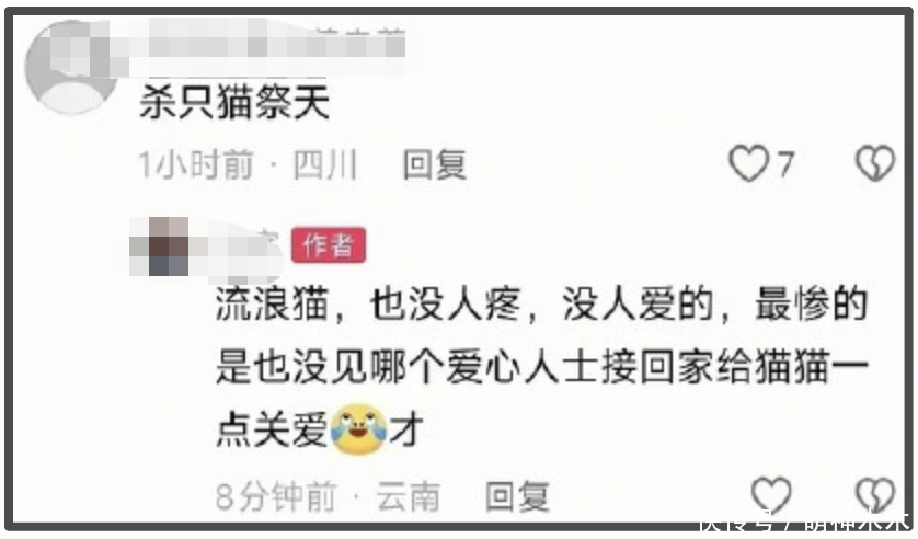 为了证实此人是不是司机,特意评论“杀只猫祭天”,言外之意指责此人就是撞死猫咪的那个司机。没想到此人没有否认,甚至还挑衅网友,说流浪猫没人疼没人爱,网上那些讨伐的网友都是假爱猫而已。校园里那么多流浪猫,也没见哪个爱心人士给猫接回家养,要不然也不会撞死猫。