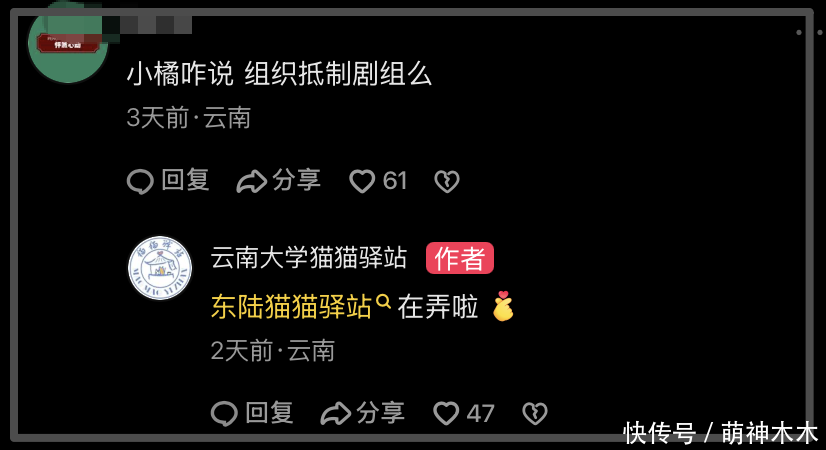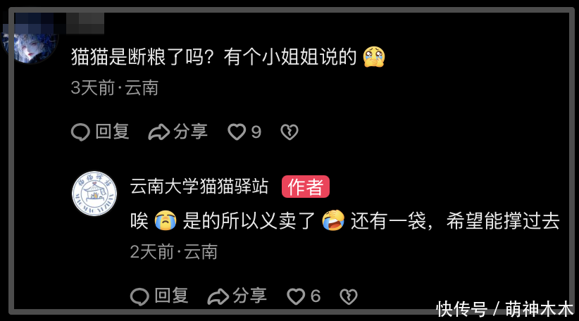 其实这个时候也有网友还抱有一丝幻想,是不是剧组删了声明,但私下里也确实妥善处理了这些事情呢?于是跑到了猫猫驿站的评论区询问情况,结果得知现在校园里的猫猫已经断粮了,驿站的负责人表示猫猫要义卖了,现在整个驿站就剩一袋猫粮,不知道能不能撑过去。如此看来,剧组承诺的喂养猫咪这件事,根本没干。