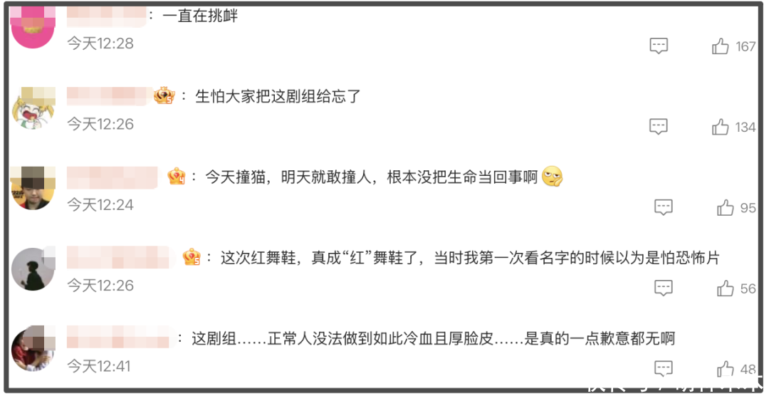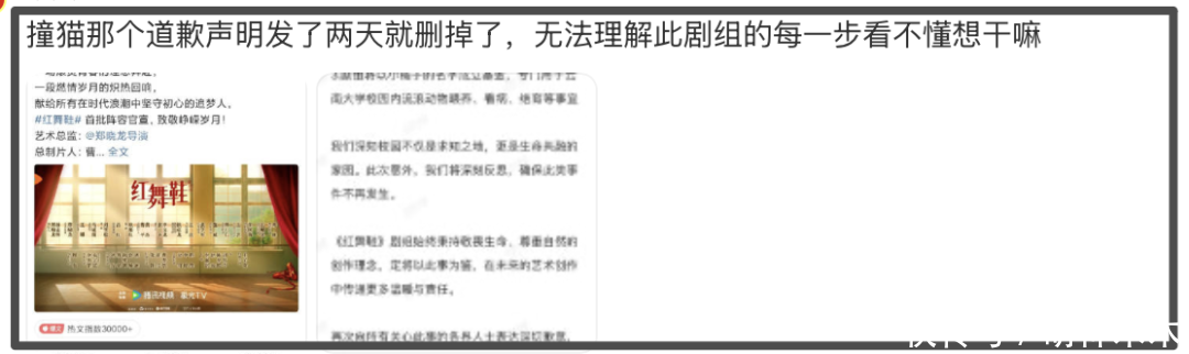 所以看到这,全网对《红舞鞋》这部剧的抵触心理已经到达了顶峰,剧组悄悄删掉道歉声明当做什么事情都没发生,就算被扒出来了又能怎样呢,网友的愤怒与剧组的冷漠傲慢形成了鲜明的对比,反正又不是撞死人,只是一只流浪猫而已。